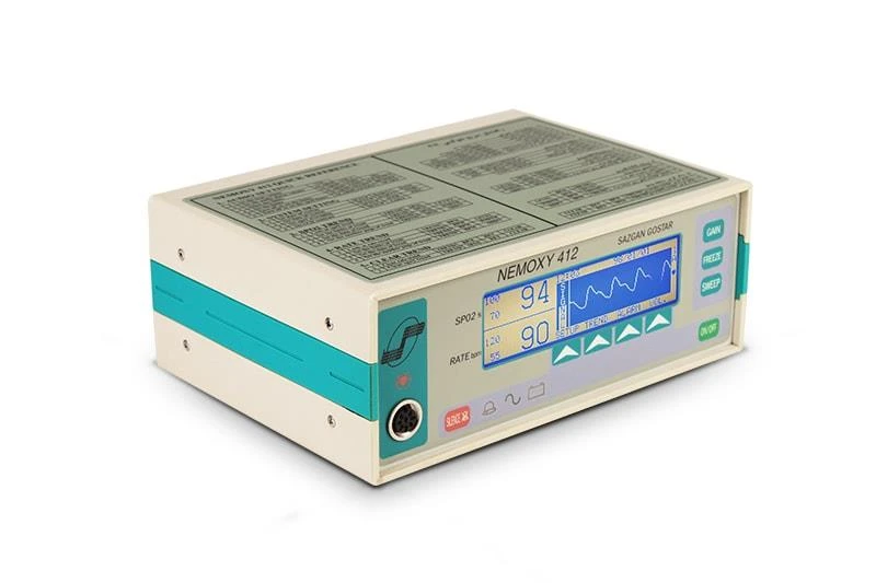 Pulse oximeter nemoxy 412: has memory to store 24-hour patient status history, has LCD and battery capacity display-6-hour battery charging
